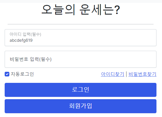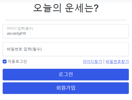 로그인페이지에 들어오자마자 자동으로 입력된 아이디를 확인 할 수있다. (물론 front부분도 dom탐색 처리해줬음)