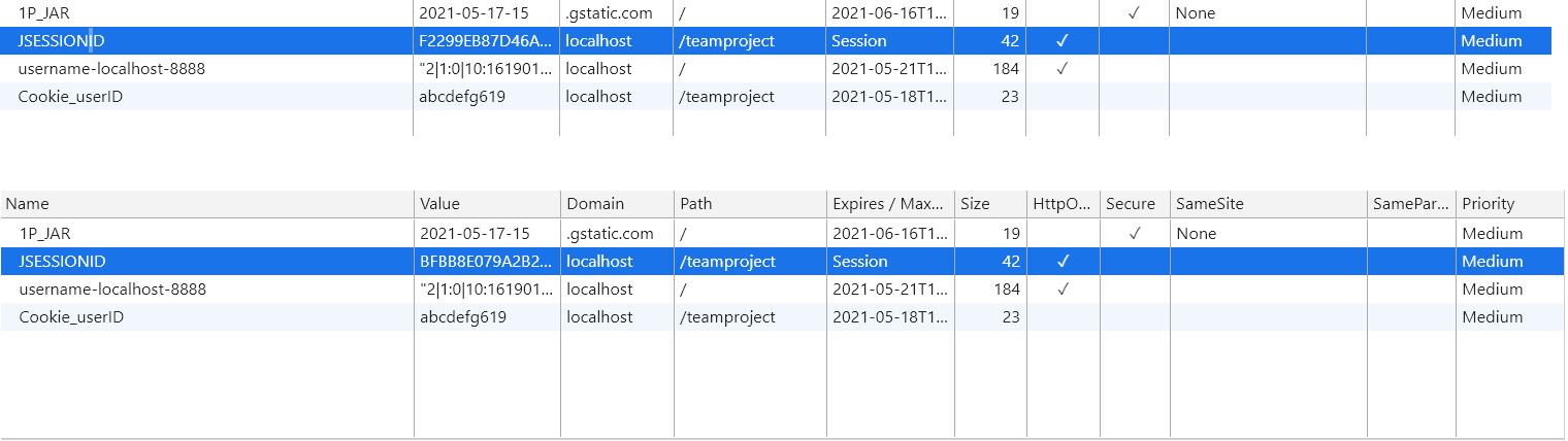 하단의 결과를 보면 , 메인 페이지에서 기존의 JSESSIONID쿠키가 삭제되고